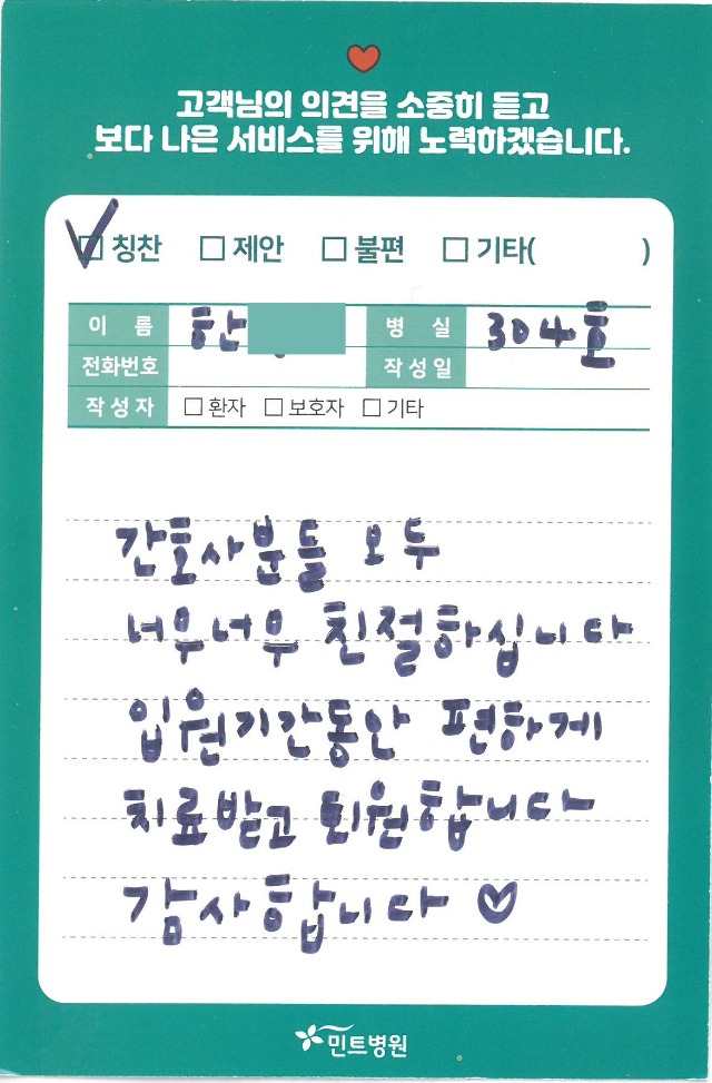 간호사분들 모두 너무너무 친절하십니다 입원 기간 동안 편하게 치료받고 퇴원합니다 감사합니다 ♡ &nb…