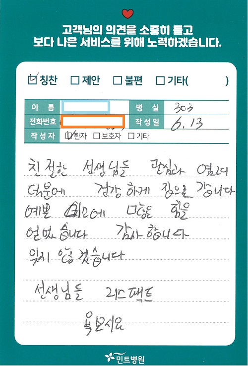 친절한 선생님들 관심과 염려 덕분에 건강하게 집으로 갑니다. 예쁜 미소에 많은 힘을 얻었습니다. 감사합니다. …